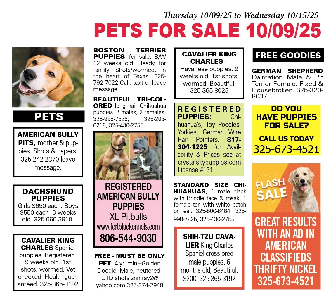 Also, you can list your pet for sale here too! Place your ad online, or give us call at 325-673-4521. We’re always happy to help!